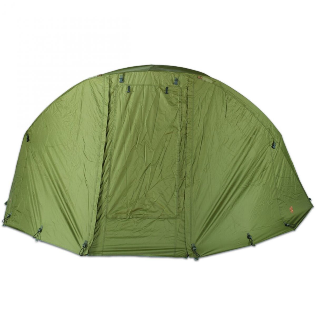 Plášť navíc po natažení na bivak a ukotvení vytvoří v přední části, tedy před bivakem, předsíňku, která je ideální na ponechání zavazadel, které nemusíme mít ve vnitřním prostoru bivaku. Hlavní vstupní panel nabízí plný panel, moskytiéru, či lze připevnit pomocí suchého zipu i slídový panel. Po obou bocích v přední části naleznete dva držáky prutů, které je fixují pomocí suchých zipů.