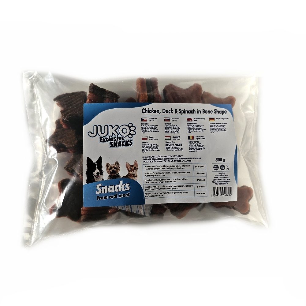 Lahodný pamlsek ve tvaru kosti s kuřecím masem, kachnou a špenátem.