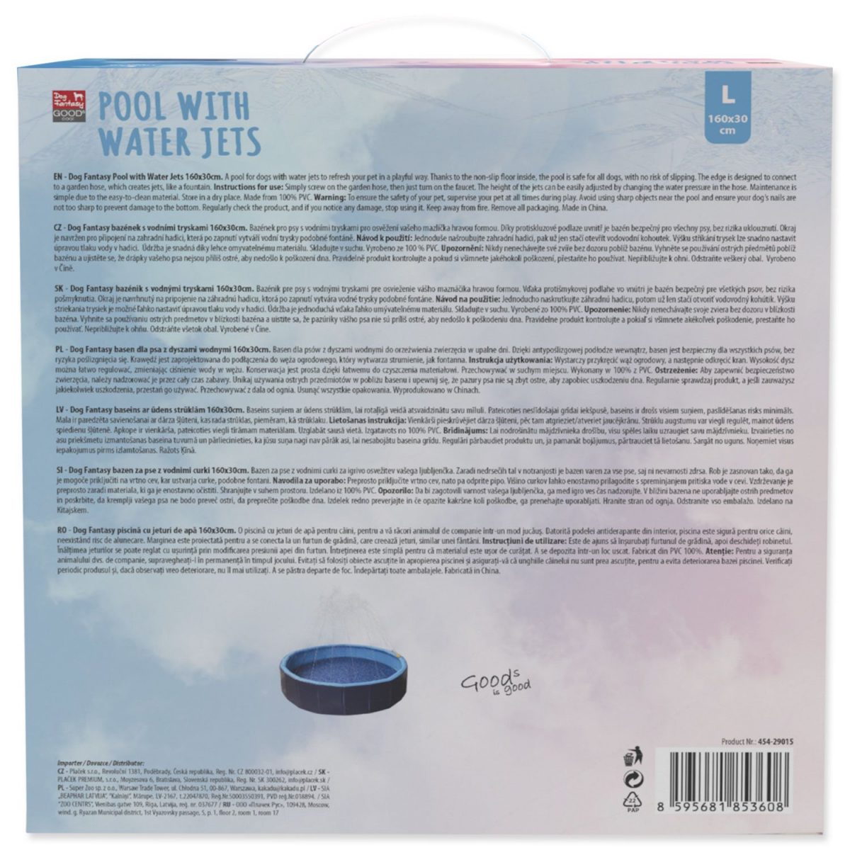 Bazének pro psy s vodními tryskami od Dog Fantasy – ideální způsob, jak se váš pejsek může v letních vysokých teplotách úžasně zchladit. Hledáte skvělý způsob, jak ochladit a zabavit svého psa během horkých letních dnů? Tento bazén poskytne vašemu mazlíčkovi osvěžení a radost z hraní díky jemným vodním tryskám, které se snadno připojí k vaší zahradní hadici. S protiskluzovou podlahou a kvalitním PVC materiálem je bezpečný, odolný a velmi snadno udržovatelný. Klíčové Vlastnosti: Osvěžení a zábava: Vodní trysky vytvoří osvěžující fontánu, která vašeho psa nejen ochladí, ale i pobaví. Perfektní pro horké letní dny! Rychlé a snadné použití: Rozložíte i složíte jednoduše bez potřeby pumpičky. Voda lze pohodlně vypustit vypouštěcím ventilem na dolním okraji bazénku. Bezpečnost na prvním místě: Protiskluzový povrch zabraňuje uklouznutí, takže váš pes si může užívat hru bez obav. Odolný materiál z PVC je nejen bezpečný, ale i snadno omyvatelný, což zajišťuje dlouhou životnost produktu. Komfortní použití: Navrženo pro snadnou údržbu – po použití stačí opláchnout, vysušit a uskladnit na suchém místě. Specifikace Rozměry: průměr 160 cm x výška 30 cm Materiál: 100 % PVC Instalace: Připojte zahradní hadici k okraji bazénku a otevřete vodovodní kohoutek. Použití Položte bazén na rovný povrch. Připojte zahradní hadici k okraji brouzdaliště. Otevřete kohoutek a nastavte tlak vody pro požadovanou výšku trysek. Po použití opláchněte, usušte a uskladněte na suchém místě. Upozornění Bezpečné použití: Udržujte daleko od ostrých předmětů a ohně. Po každém použití důkladně vyčistěte a usušte. Údržba: Jednoduché čištění a skladování na suchém místě prodlouží životnost produktu. Nikdy nenechávejte psa bez dozoru poblíž bazénu a pravidelně kontrolujte jeho stav. Ujistěte se, že drápky vašeho psa nejsou příliš ostré, aby nedošlo k poškození materiálu. V případě poškození jej přestaňte používat. Odstraňte veškerý obal. Vyrobeno v Číně. Dog Fantasy bazének je ideálním způsobem, jak zajistit, že váš pes si užije horké letní dny plné osvěžení a zábavy!