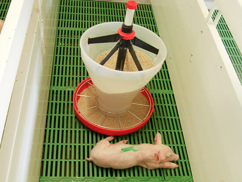 Adaptivní krmítko s násypkou, pro krmení selat při odstavu, jednoduché připevnění k roštu, snadná údržba, 10 krmných míst, regulace přísunu krmiva, objem misky 9 l, objem násypky 21 l, průměr misky 42,5 cm, výška krmítka 68 cm.