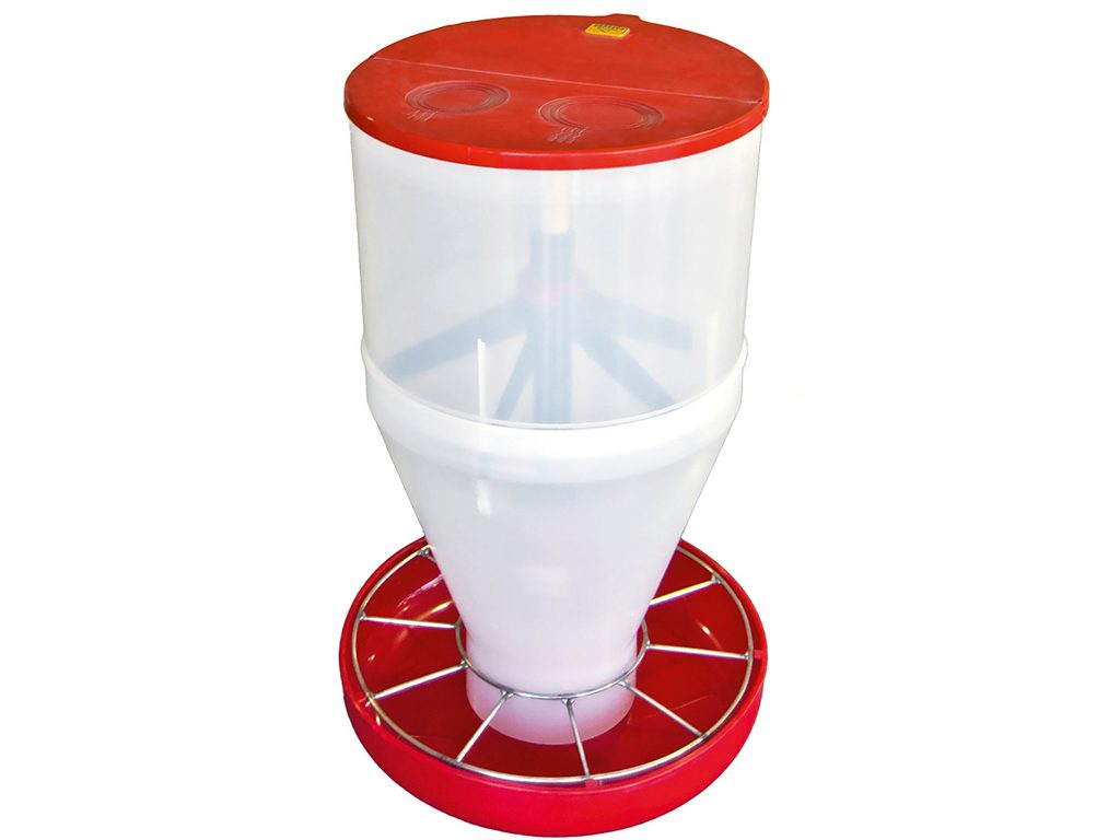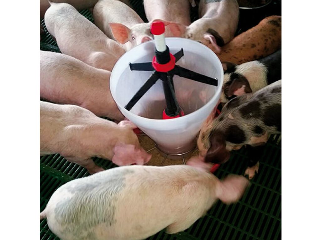 Adaptivní krmítko pro krmení selat při odstavu, 10 krmných míst, objem misek 9l a násypky 21l, průměr 42,5 cm, výška 68 cm. Objevte adaptivní krmítko s násypkou pro selata, které zajišťuje plynulý přechod na pevnou stravu a podporuje jejich zdravý růst od prvního dne! Krmítko s násypkou je ideální řešení pro krmení selat při odstavu, díky své konstrukci s 10 krmnými mísami a velkokapacitní násypkou. Je vybaveno jednoduchým systémem připevnění k roštu, což usnadňuje instalaci a zajišťuje stabilitu. Objem krmné misky je 9 litrů, zatímco násypka má kapacitu 21 litrů, díky které umožňuje dostatečný přísun krmiva pro více zvířat najednou. Přísun krmiva lze snadno regulovat otočením nastavovacího šroubu, což usnadňuje přizpůsobení krmného režimu potřebám selat. Krmítko je ideální pro prasata v prvních 7-10 dnech po odstavu.