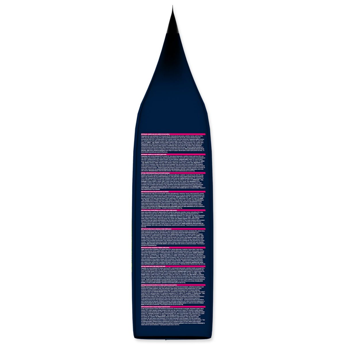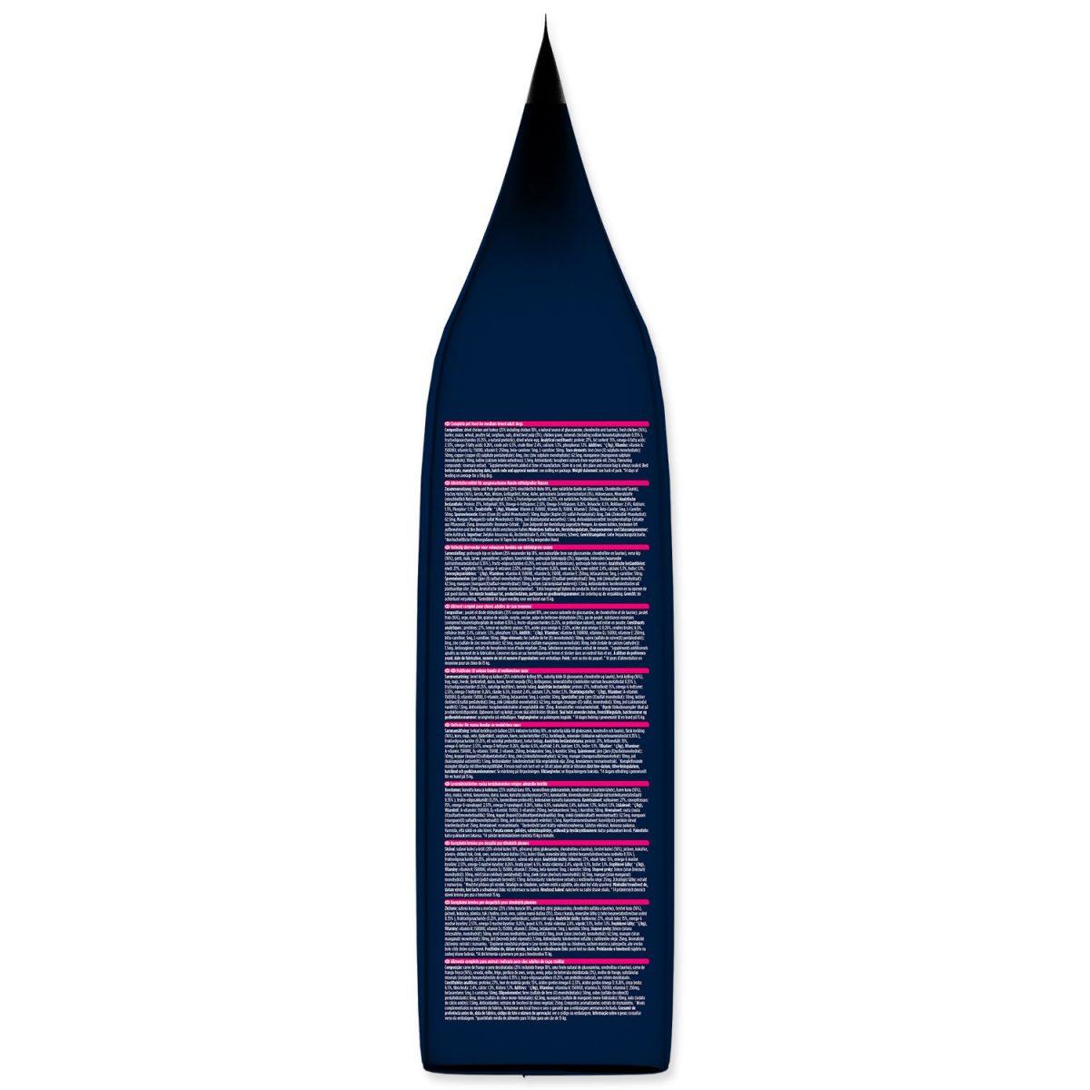 Složení: Sušené kuřecí a krůtí (25 % včetně kuřecí 18 %, přirozený zdroj glukosaminu, chondroitinu a taurinu), čerstvé kuřecí (16 %), ječmen, kukuřice, pšenice, drůbeží tuk, čirok, oves, sušená řepná dužina (3 %), kuřecí šťáva, minerální látky (včetně hexametafosforečnanu sodného 0,35 % ), fruktooligosacharidy (0,25 %, přírodní prebiotikum), sušená celá vejce.