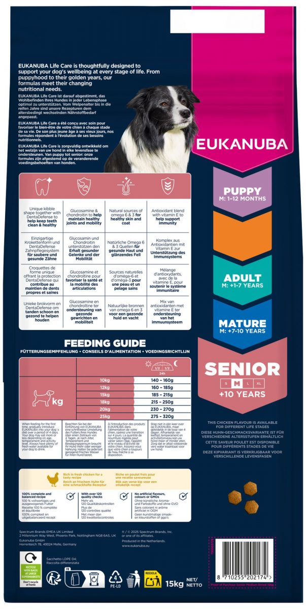 Určeno pro seniory středních plemen. Čerstvé kuřecí maso pro kvalitní bílkoviny a vitalitu. L-karnitin podporuje spalování tuků a odlehčuje kloubům. Směs vlákniny s prebiotiky (FOS, řepná dužina) udržuje zdravou střevní mikroflóru. Glukosamin pečuje o klouby, vápník o pevné kosti. Omega-3 a 6 mastné kyseliny pro zdravou kůži a lesklou srst. Antioxidanty s vitamínem E posilují obranyschopnost. Šestihranné granule se systémem DentaDefense pomáhají udržovat čisté a zdravé zuby. Kompletní a vyvážené krmivo, které podporuje optimální kondici a vitalitu psích seniorů.