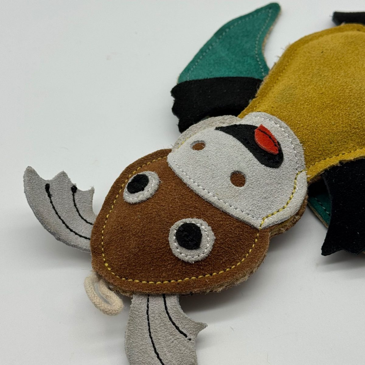 Kůže použita na hračkách je barvena zdravotně nezávadnými barvami, které mohou při kontaktu se slinami nebo vodou mírně pouštět. Nemusíte se však bát, pejskovi to nějak neuškodí. Hračka je vyplněná přírodními kokosovými vlákny, díky čemuž je na pohmat tvrdá.