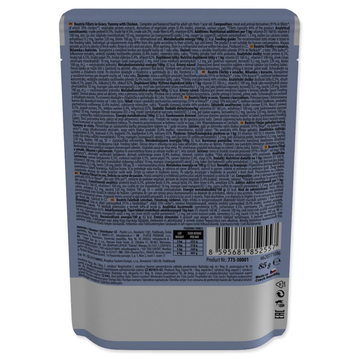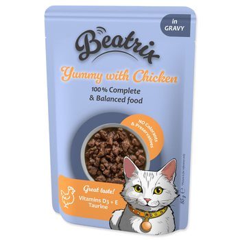 Kompletní krmivo pro dospělé kočky od 1 roku věku. Lahodné kuřecí kousky v jemné omáčce potěší i vybíravé kočky. Díky šetrnému složení je vhodné pro každodenní krmení a podporuje optimální kondici a vitalitu. Kompletní a vyvážené mokré krmivo vhodné jako samostatné jídlo nebo doplněk ke granulím Bez umělých barviv a konzervantů Obohaceno o vitamíny A, D3 a E pro podporu imunity a celkové kondice Obsahuje důležité minerály – zinek, železo, měď a selen – pro zdravou srst a vitalitu Lahodná receptura s kuřecím pro skvělou chutnost a pro silné svaly Obsahuje zeleninu jako přirozený zdroj vlákniny a živin pro zdravé trávení Porovnejte Beatrix s vaším krmivem Ingredience a složení Kuřecí maso Olej a tuky Minerální látky 100% nutričně vyvážené krmivo za dostupnou cenu Bez umělých barviv a konzervantů Vitamíny A, D3, E a minerály Podporuje zdravé trávení Vitamíny a minerály Vitamin A Vitamin D3 Vitamin E Měď (Cu) Zinek (Zn) Mangan (Mn) Jód (I) Náš příběh a hodnoty značky Značky Drax a Beatrix vznikly z touhy najít to nejlepší možné řešení pro všechny, kteří chtějí svému mazlíčkovi dopřát dlouhý a šťastný život plný lásky a společných chvil. Naším zákazníkem je člověk, kterému na jeho zvířeti opravdu záleží – pro kterého je pes nebo kočka součástí rodiny. Víme, jak hluboký je vztah mezi člověkem a zvířetem. Kolik radosti, klidu a bezpodmínečné lásky nám dávají – často víc, než si uvědomujeme. A právě proto si zaslouží totéž od nás. Váha Denní dávka krmení 3 kg 255 g 4 kg 310 g 5 kg 360 g 6 kg 405 g Nejčastější dotazy (FAQ) Pro koho je toto krmivo vhodné? Pro všechny dospělé kočky od 1 roku věku, včetně vybíravých koček. Obsahuje krmivo taurin? Ano, obsahuje 1000 mg/kg taurinu, který je nezbytný pro zdravé srdce a zrak. Je tato receptura vhodná pro každodenní krmení? Ano, jedná se o kompletní a vyvážené krmivo vhodné i jako hlavní strava. Jaké jsou výhody bílé ryby? Je přirozeným zdrojem omega-3 mastných kyselin, které podporují zdraví kůže, srsti i srdce. Jaký je přínos biotinu a inulinu? Biotin zajišťuje zdravou a lesklou srst, inulin podporuje trávení a střevní mikroflóru. Složení: Maso a výrobky živočišného původu (91% ve filetkách*, z toho 10% kuřecí*), bílkovinné extrakty, vedlejší výrobky rostlinného původu (0,4% inulin), minerální látky, cukry. *Filetky obvykle tvoří 44% produktu. Analytické složky: Hrubý protein 8,5%, hrubý tuk 4,5%, hrubý popel 2%, hrubá vláknina 0,4%, vlhkost 82%. Doplňkové látky: Nutriční doplňkové látky v 1 kg: vitamín D3 160 m.j., vitamín E 100 mg, zinek (síran zinečnatý monohydrát) 10 mg, mangan (oxid manganatý) 2 mg, měď (síran měďnatý pentahydrát) 1,2 mg, jód (jodičnan vápenatý, bezvodý) 0,2 mg, taurin 520 mg, biotin 100 µg. m.j. = mezinárodní jednotky. Metabolizovatelná energie/100g: 82 kcal.