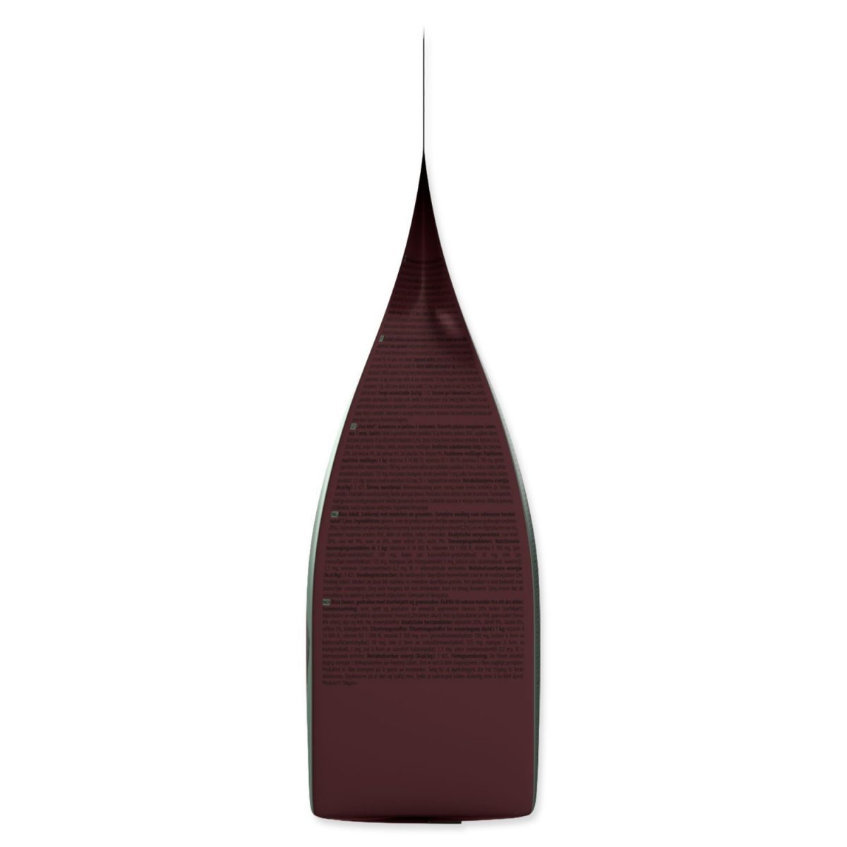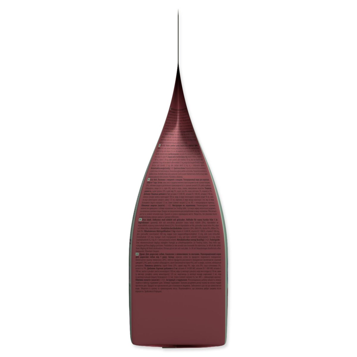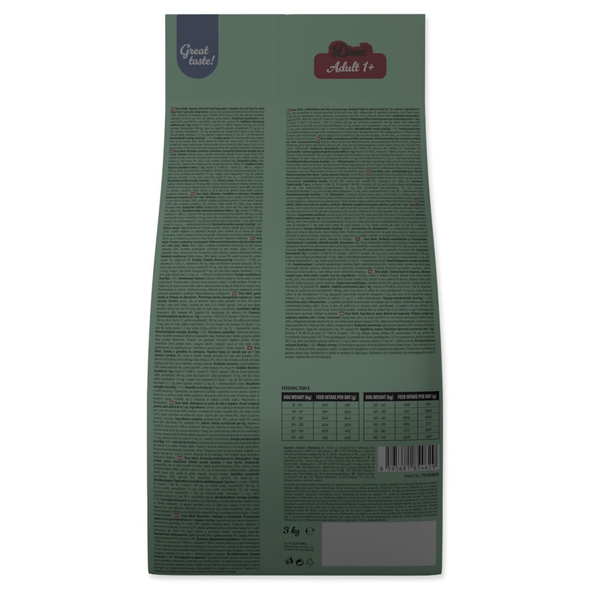 Složení: Obilniny, maso a výrobky živočišného původu (z toho sušené hovězí 20 %), vedlejší výrobky rostlinného původu (z toho sušená čekanka 0,2 %), ryby a vedlejší výrobky z ryb, zelenina (z toho hrášek 4 %), oleje a tuky, semínka, minerální látky.