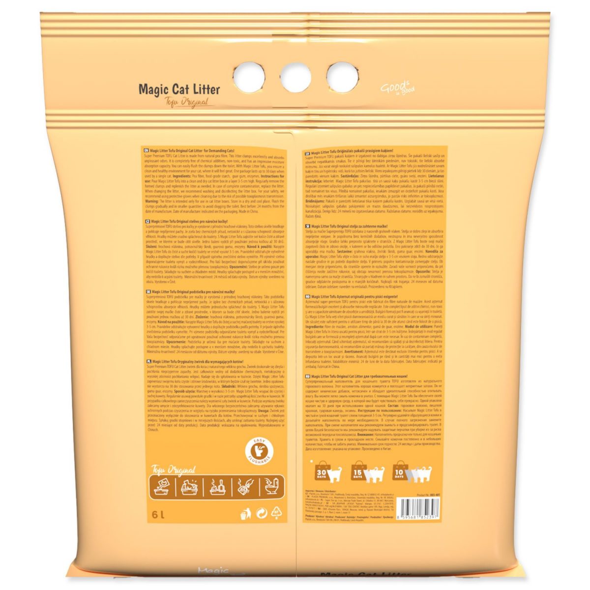 Je zcela bez chemických přísad, netoxické a s úžasnou schopností absorpce vlhkosti. Hrudky můžete snadno spláchnout do toalety. S Magic Litter Tofu zajistíte své kočce čisté a zdravé prostředí, ve kterém se bude cítit skvěle. Jedno balení vydrží při používání jednou kočkou až 30 dnů.