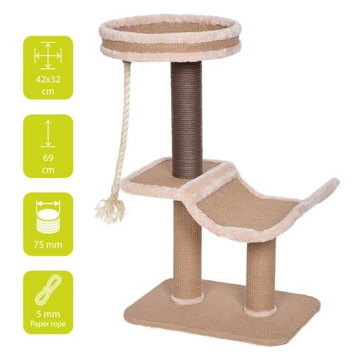 Přirodní materiály: Strom je vyroben z přírodní juty, papírové šňůry a plyše, které jsou pro kočky příjemné a bezpečné.