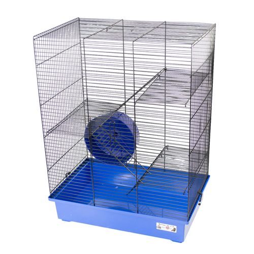 Klec pro potkany s dostatečně hustou mřížkou svařovanou z kovového důrtu černé fabry, tři kovová patra, žebříky a plastový kolotoč modré barvy. Klec má plastovou základnu modré fabry.