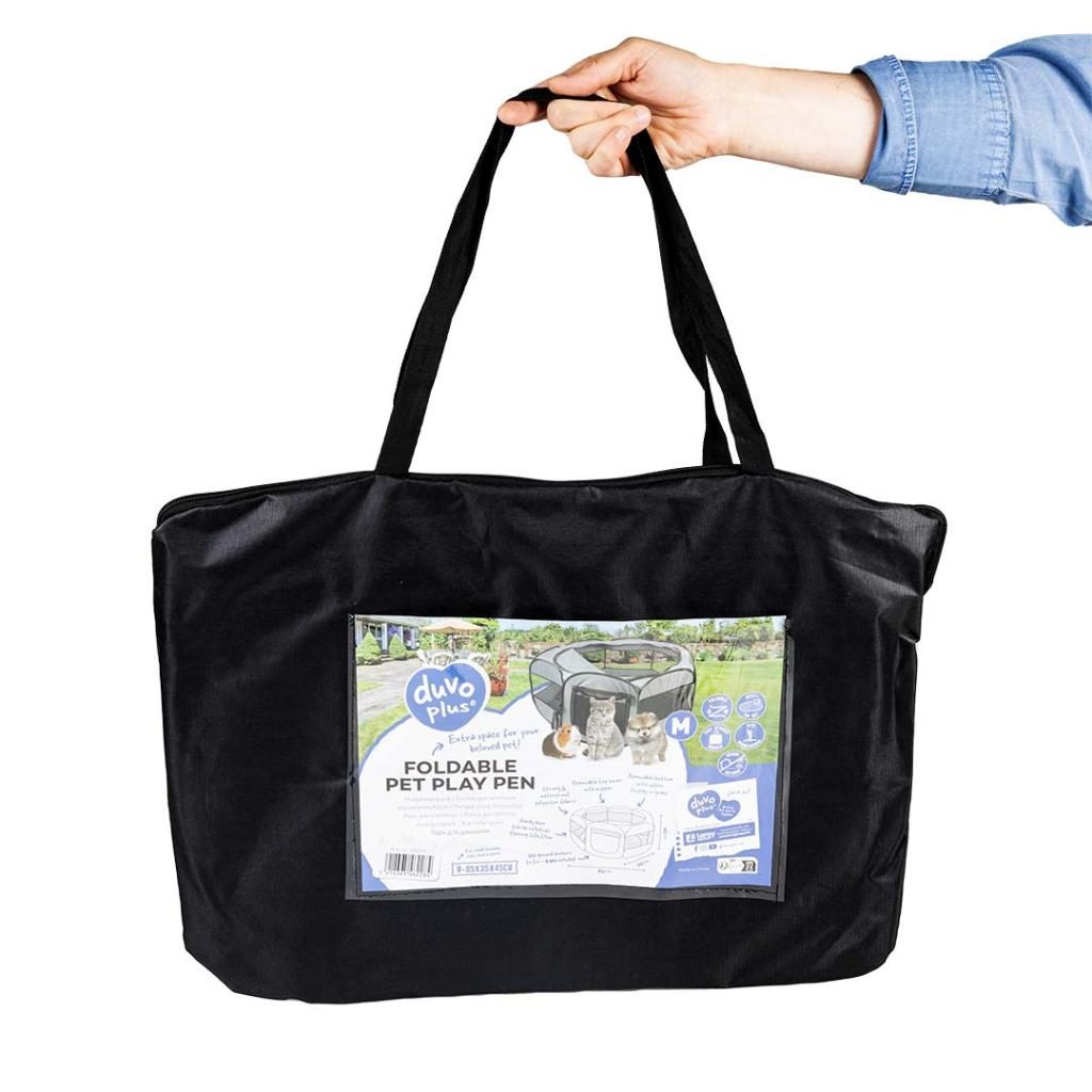 Dopřejte svým mazlíčkům bezpečné a zábavné místo na hraní – kdekoli!Tento lehký a praktický skládací výběh od duvoplus je ideálním doplňkem jako dodatečný prostor na hraní pro vaše domácí mazlíčky. Rozložíte ho během několika sekund a stejně snadno jej složíte a uložíte do praktické přenosné tašky. Díky horní síťce nemohou zvířátka vyskočit ven, zatímco odnímatelná spodní část na suchý zip umožňuje její rychlé odejmutí, pokud si vaši mazlíčci raději hrají přímo na trávě. Materiál je vodoodpudivý a odolný, vhodný pro vnitřní i venkovní použití.Výběh má rolovací dvířka pro snadný přístup – ideální na cestování, do zahrady nebo na dovolenou k moři.