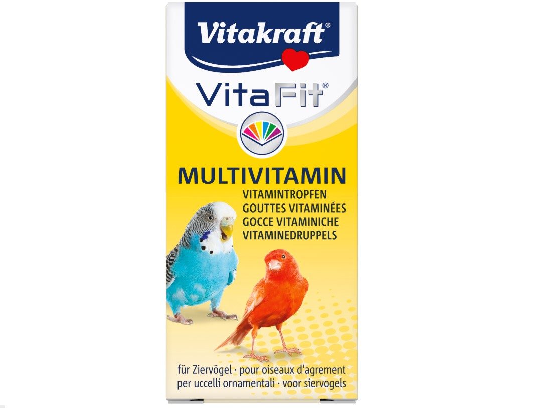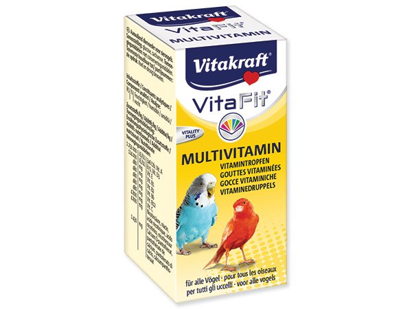 Doplňkové krmivo pro ptáky. Vitamínové kapky zajišťující pokrytí denní potřeby vitamínů. Celkově podporují kondici a zdraví ptáků.