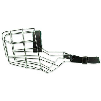Kovový náhubek s koženými řemínky na zapínání pro fenu dalmatina. Kovový náhubek s koženými řemínky na zapínání pro fenu dalmatina.