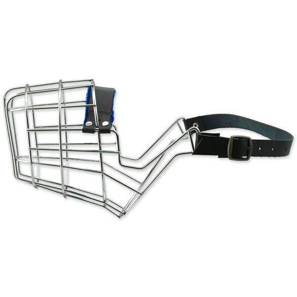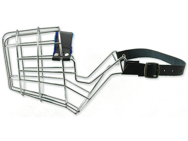 Kovový náhubek s koženými řemínky na zapínání pro fenu pitbulla. Kovový náhubek s koženými řemínky na zapínání pro fenu pitbulla.