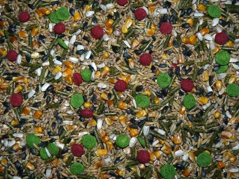 Složení: kukuřice, pšenice, ječmen, kardi, slunečnice černá, slunečnice žíhaná, oves celý, čirok červený, peluška, hrách žlutý, úsušky pícnin, extrudované obiloviny.