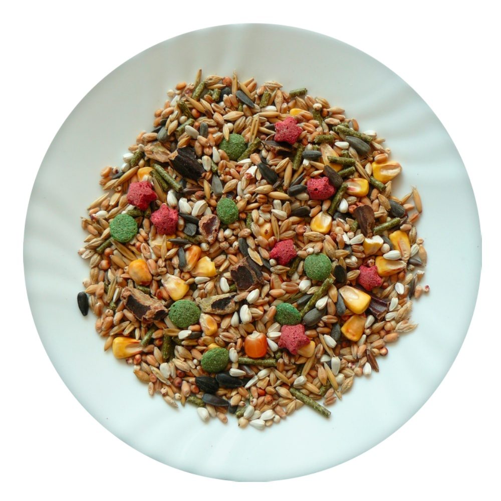 Složení: kukuřice, pšenice, ječmen, kardi, slunečnice černá, slunečnice žíhaná, oves celý, čirok červený, peluška, hrách žlutý, úsušky pícnin, extrudované obiloviny.
