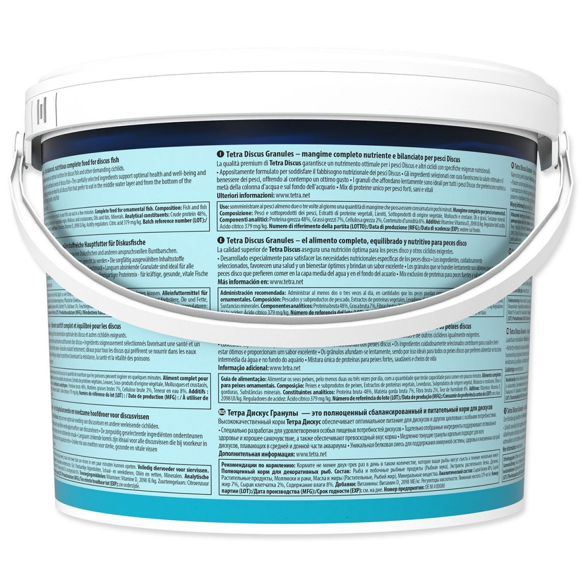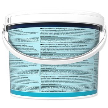 Složení: ryby a vedlejší výrobky z ryb, obiloviny, bílkovinné extrakty rostlinného původu, maso a produkty živočišného původu, měkkýši a korýši, kvasnice, mléko a mléčné výrobky, řasy, oleje a tuky, cukry, vitamíny.
