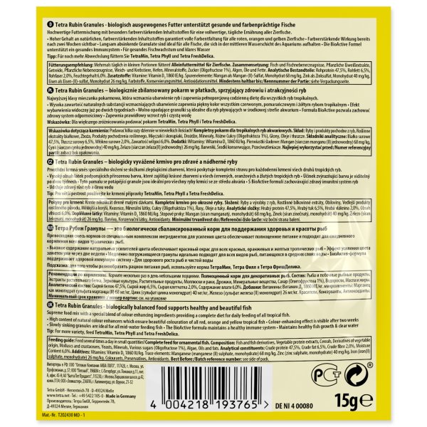 Kompletní krmivo pro ozdobné ryby. Pomalu klesající granule zaručují plnohodnotnou a pestrou výživu, přírodní barevné aktivátory plně rozvíjí přirozené zabarvení.