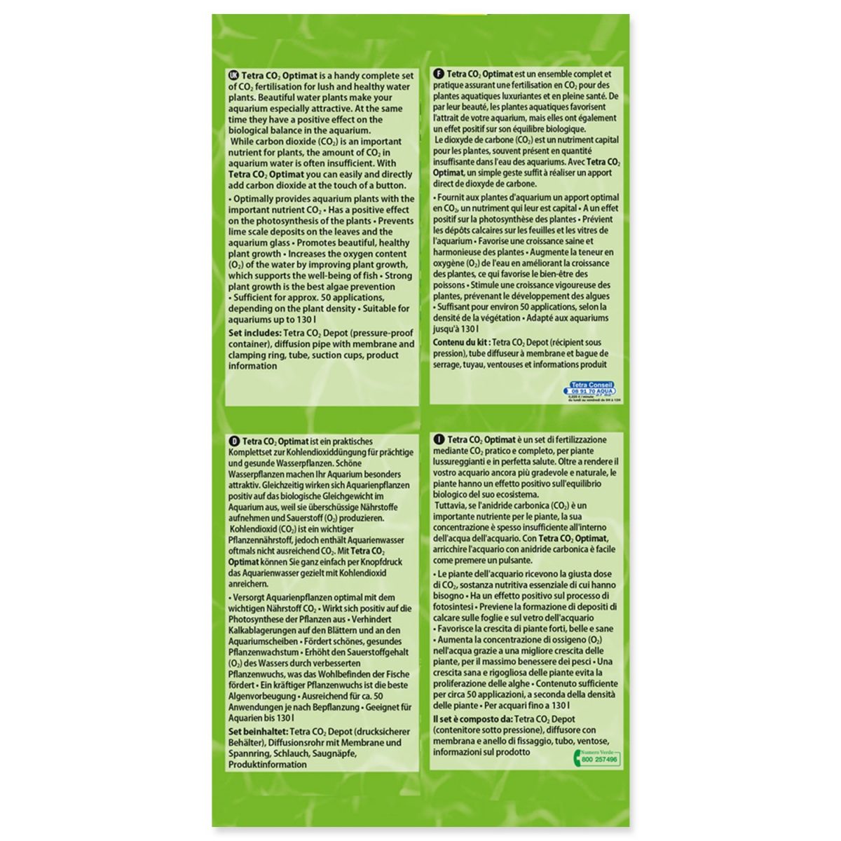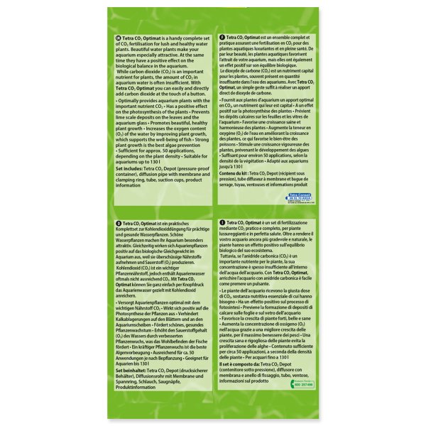 Cíleně působící systém k ošetření rostlin, jeho použití je jednoduché a bezpečné. Uhličité látky jsou důležité pro kvalitní růst akvarijních rostlin. Pečují o udržení biologické rovnováhy, zatímco se během fotosyntézy z rostlin vylučuje kyslík a kromě toho rozkládají škodlivé sloučeniny dusíku. Mimo to poskytují bujnost a zdraví vodním rostlinám a činí akvárium celkově atraktivnější. Zdravý růst rostlin je důležitý i proto, že omezuje nebezpečí růstu řas. Akvárium, ve kterém je rovnováha uhličitých kyselin stojí za námahu: - akvarijní rostliny budou silnější, větší a zdravější, a to během dostatečného zásobení CO2, - během hnojení rostlin CO2 se také zvýší okysličování vody, které dosud zajišťovaly jen rostliny, - hladina pH zůstane v optimální hodnotě, proto například nemohou vznikat nebezpečné reakce ammoniaku a ammonia, - pomáhá předcházet i nepěkným vápenným usazeninám na listech a plátcích rostlin.