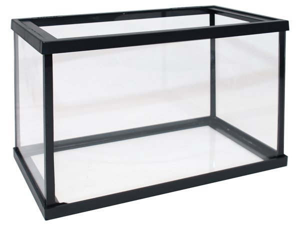 Skleněné akvárium s plastovým rámečkem nahoře i dole.