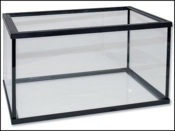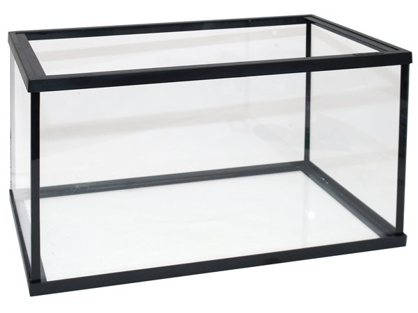 Skleněné akvárium s plastovým rámečkem nahoře i dole.