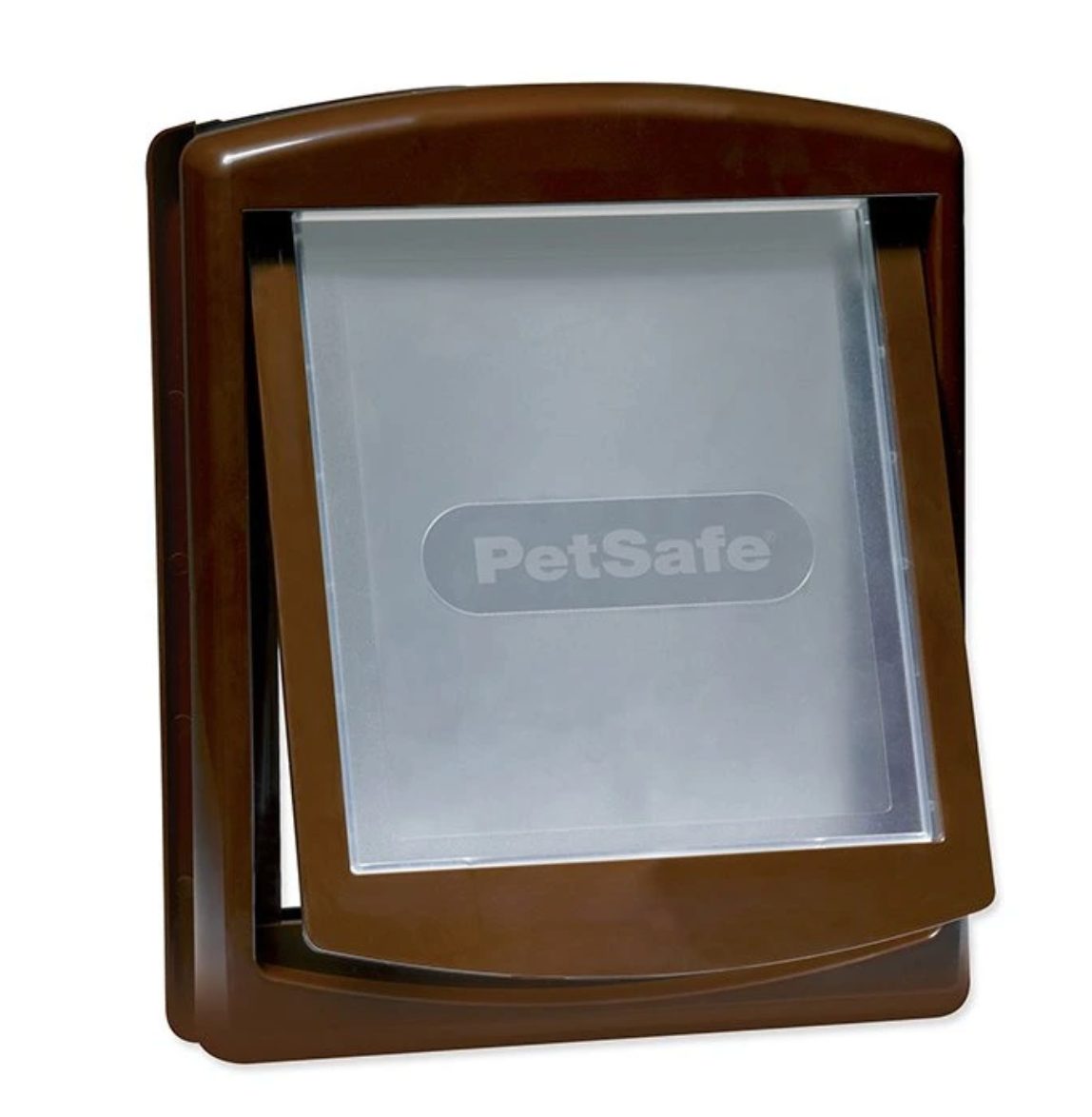 Hnědá plastová dvířka v imitaci dřeva s průhledným flapem do dřevěných či plastových dveří.