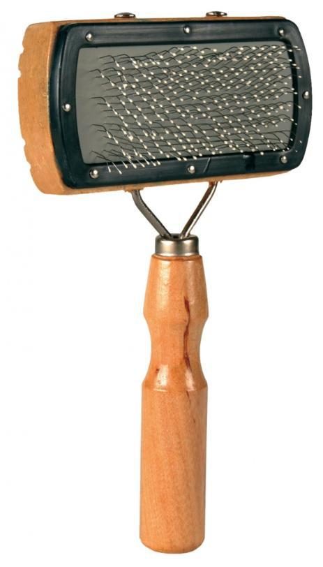 Jednostranný kartáč s dřevěnou rukojetí a drátěnými štětinami. Drátěné štětiny odstraní prach a odumřelou srst. Kůže psa je před poškrábáním chráněna gumovým zakončením drátěných štětin. Vhodný pro psy s vlnitou a hrubou srstí.
