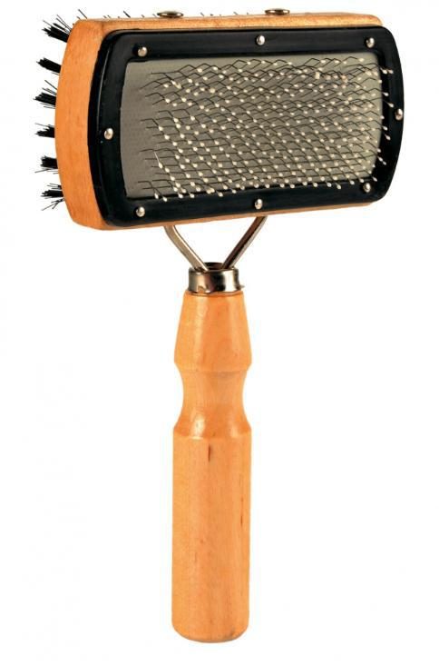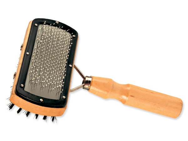 Kartáč z jedné strany - s ochranou jehliček pro péči o citlivou kůži psů. Druhá strana s umělými štětinami. Péče o srst je pro psy velmi důležitá. Doporučujeme kartáčovat či vyčesávat psa alespoň jedenkrát týdně. Tímto způsobem se nebudete pouze starat o srst psa, ale také podpoříte prokrvení, případně také můžete narazit na skryté ranky či parazity. Strana (s jehličkami) je vhodná pro všechny drátosrsté psy a psy s vlnitou srstí. Tato plemena mají silnou podsadu, kterou je třeba velmi důkladně vyčesávat.